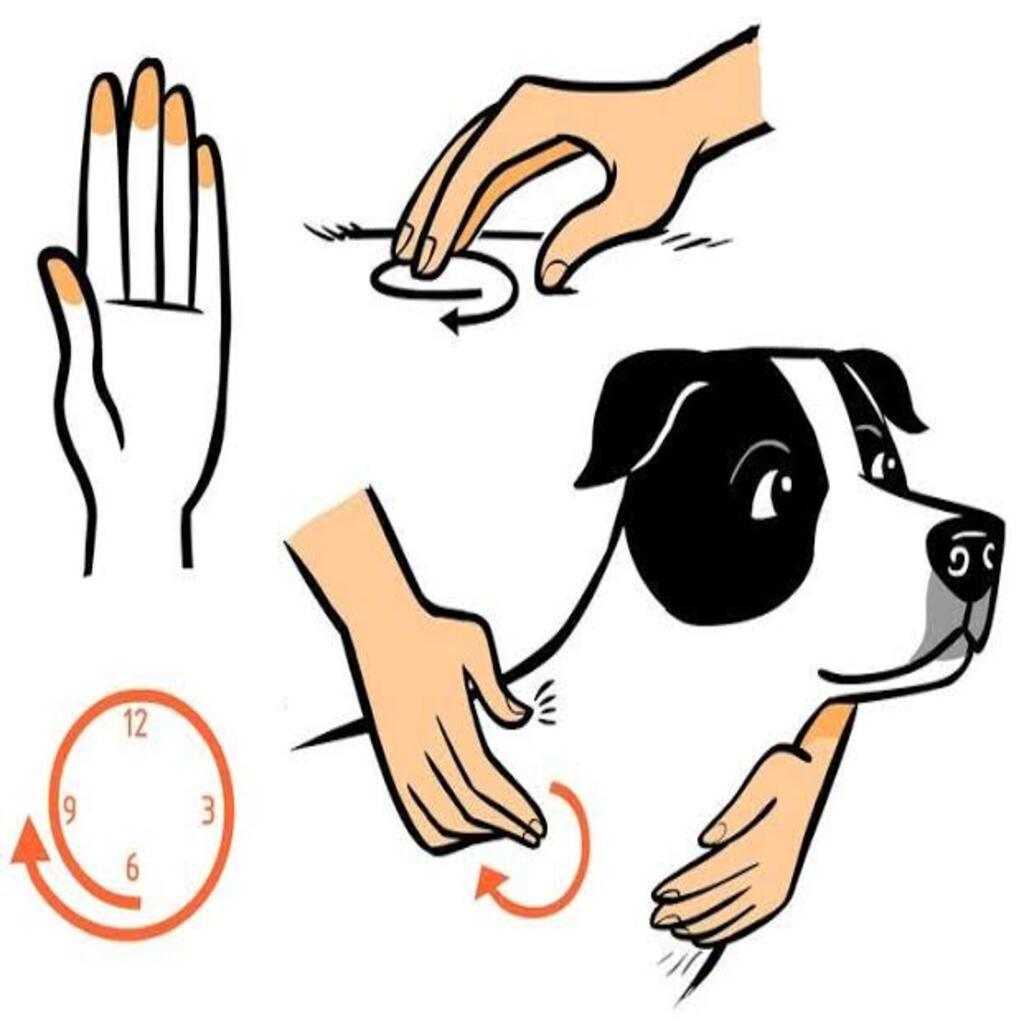 The central TTouch motion is a circle inscribed on the dog’s body. It is done by placing the fingertips on the body and tracing a clock-face circle from six o’clock around the dial past the starting point to eight o’clock. Practitioners adapt pressure, speed, and size of circle to the particular animal .